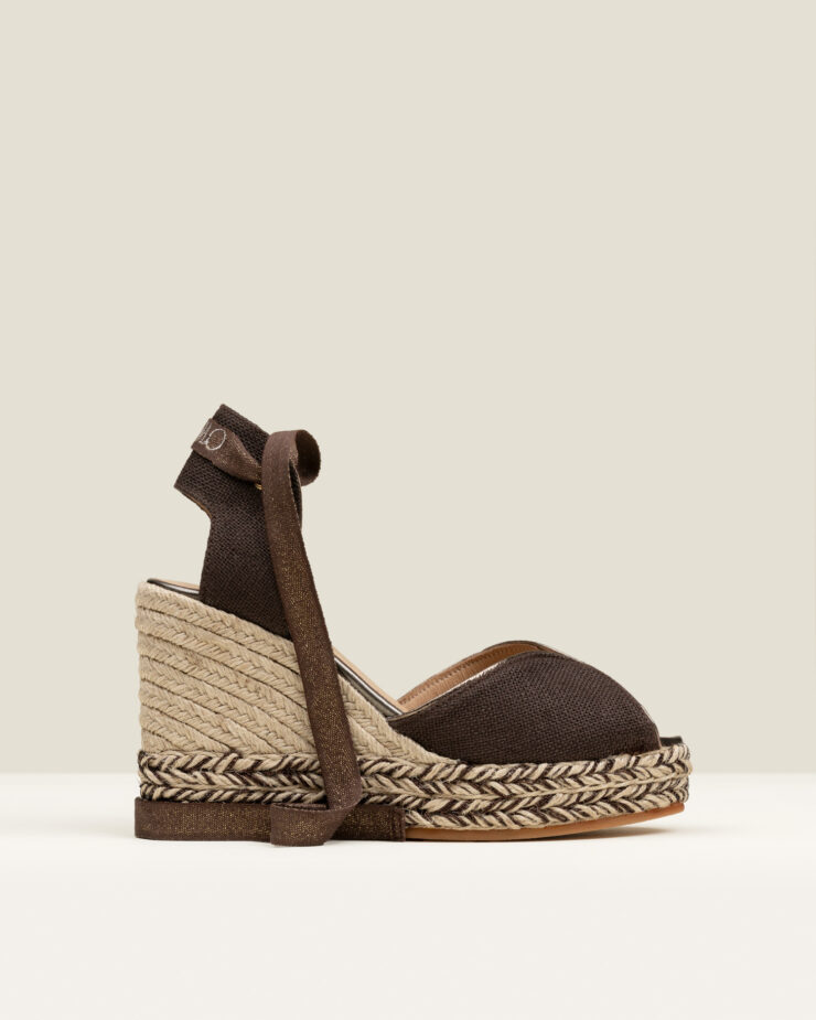 Bandy is a high wedge espadrille sandal with an open design, tied at the ankle with ribbons and finished in linen. The metallic trim in contrast adds a delicate touch of light that enhances the design with subtle elegance.