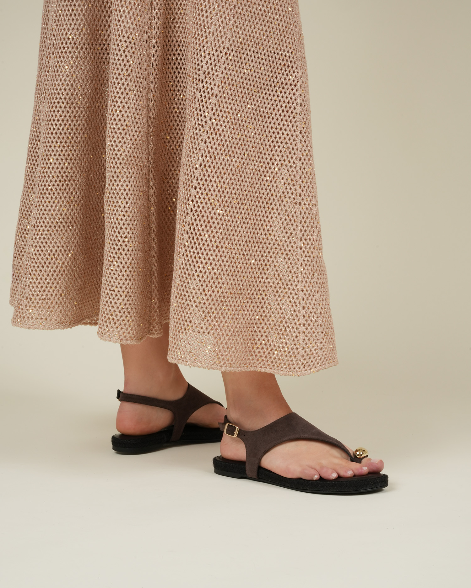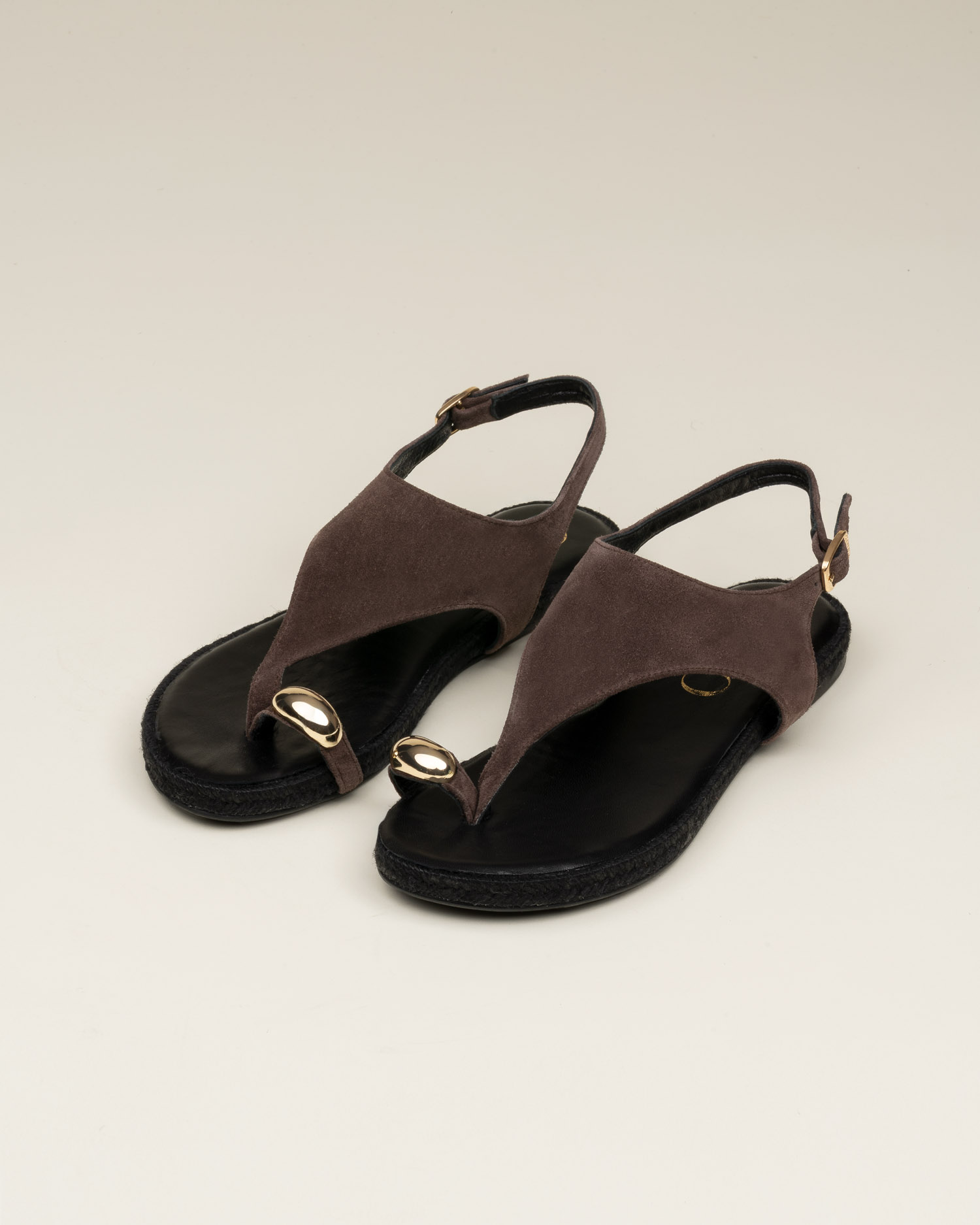 Brise is a flat toe-post espadrille with a metallic detail, crafted in soft suede that adds warmth and texture to the design.