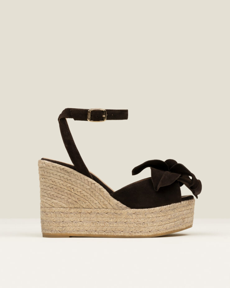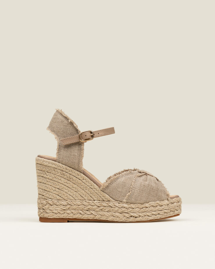 Daly is a high wedge espadrille sandal with an open design, a buckle fastening and finished in linen. The large knot with frayed detail introduces a recognisable artisanal gesture full of character.
