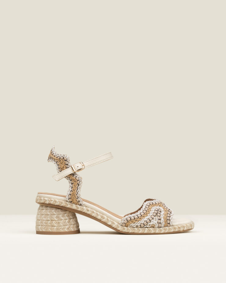 Danya es una alpargata de tacón medio tipo sandalia de tira abierta, con cierre de hebilla y cordelas de algodón bordadas a mano que aportan textura y carácter artesanal. Las formas en onda dibujan el pie con un gesto suave y femenino.