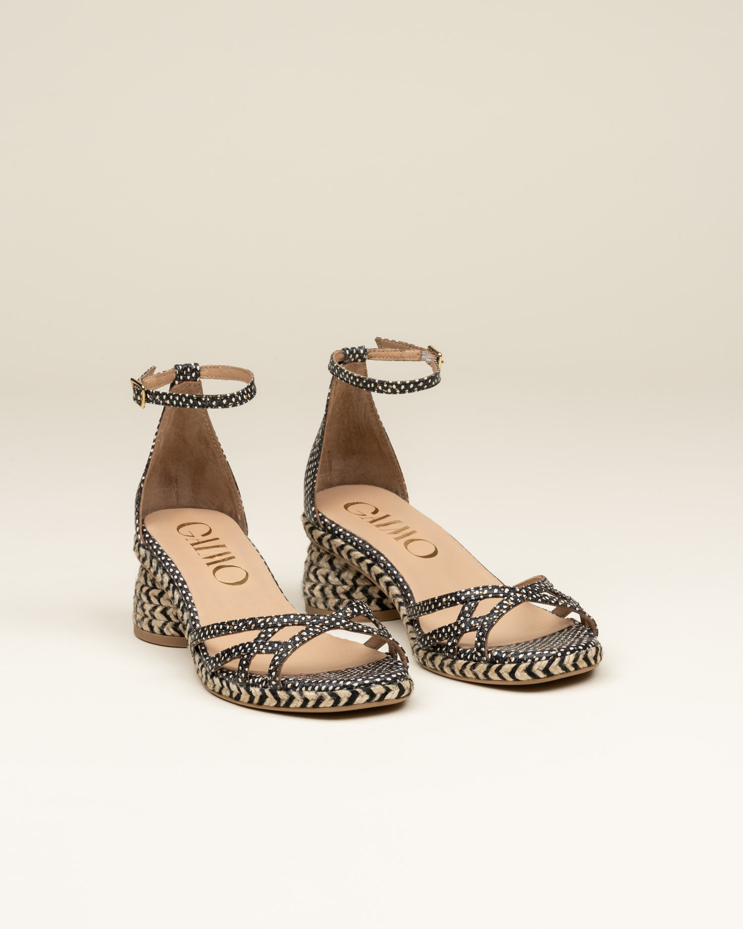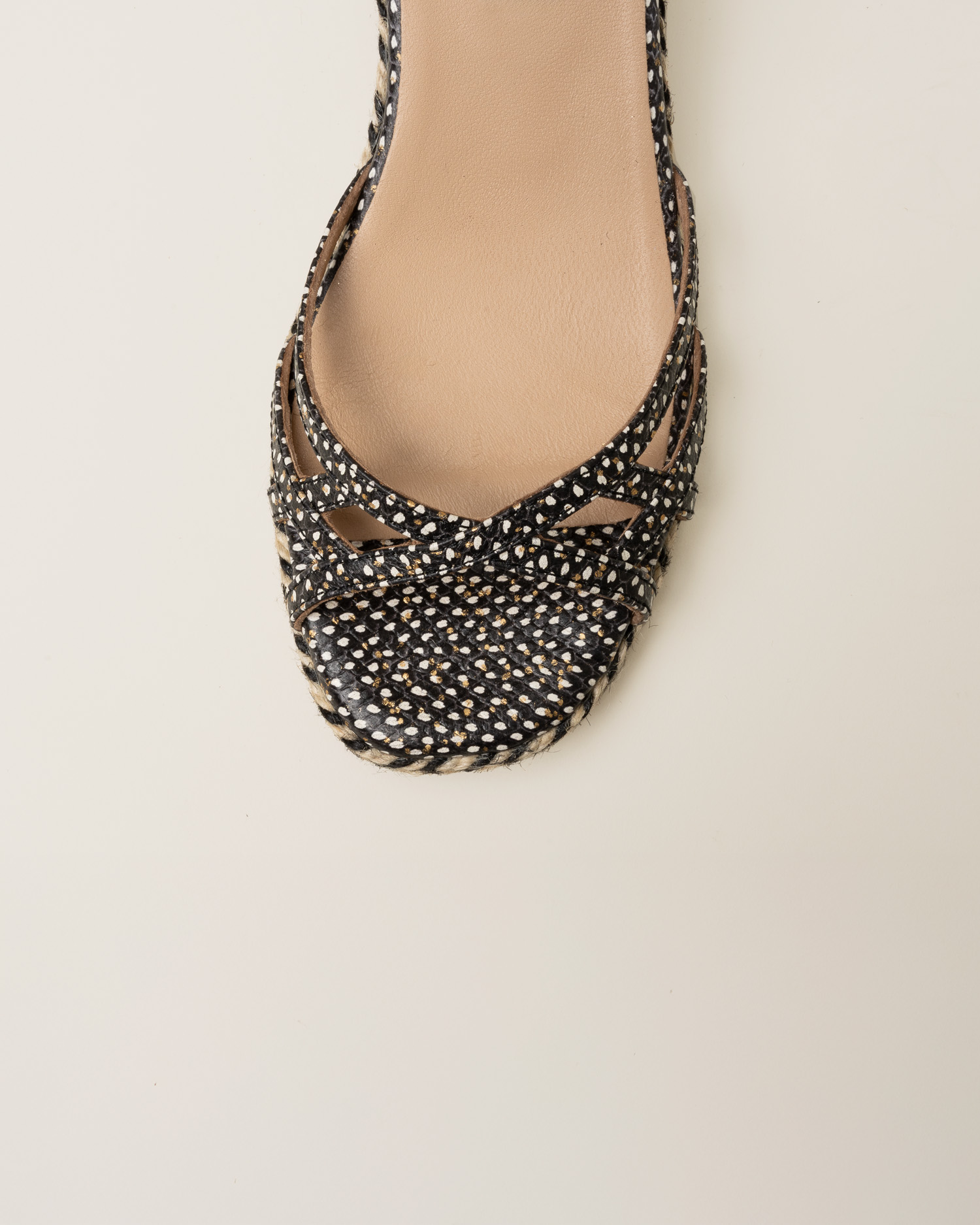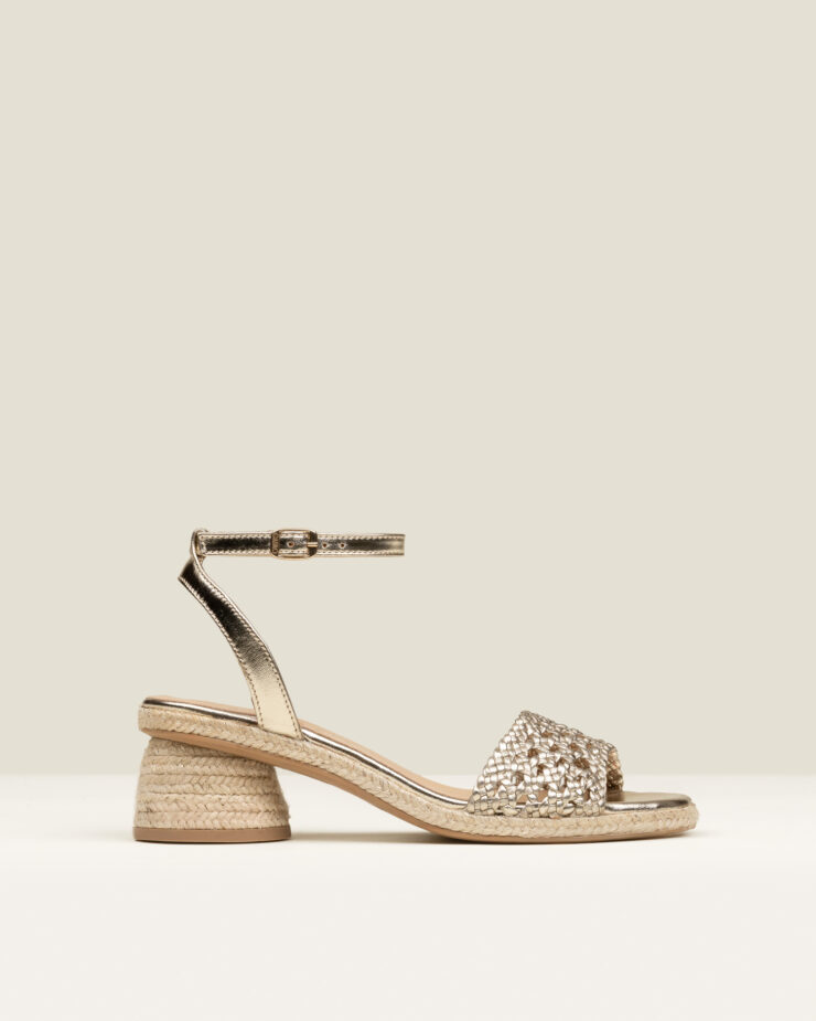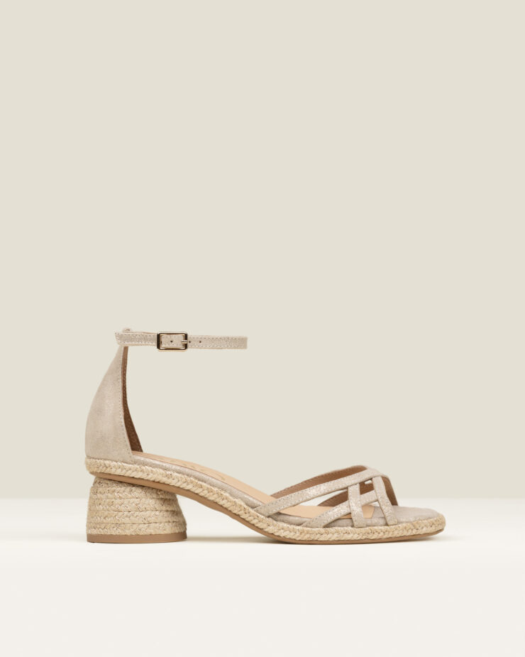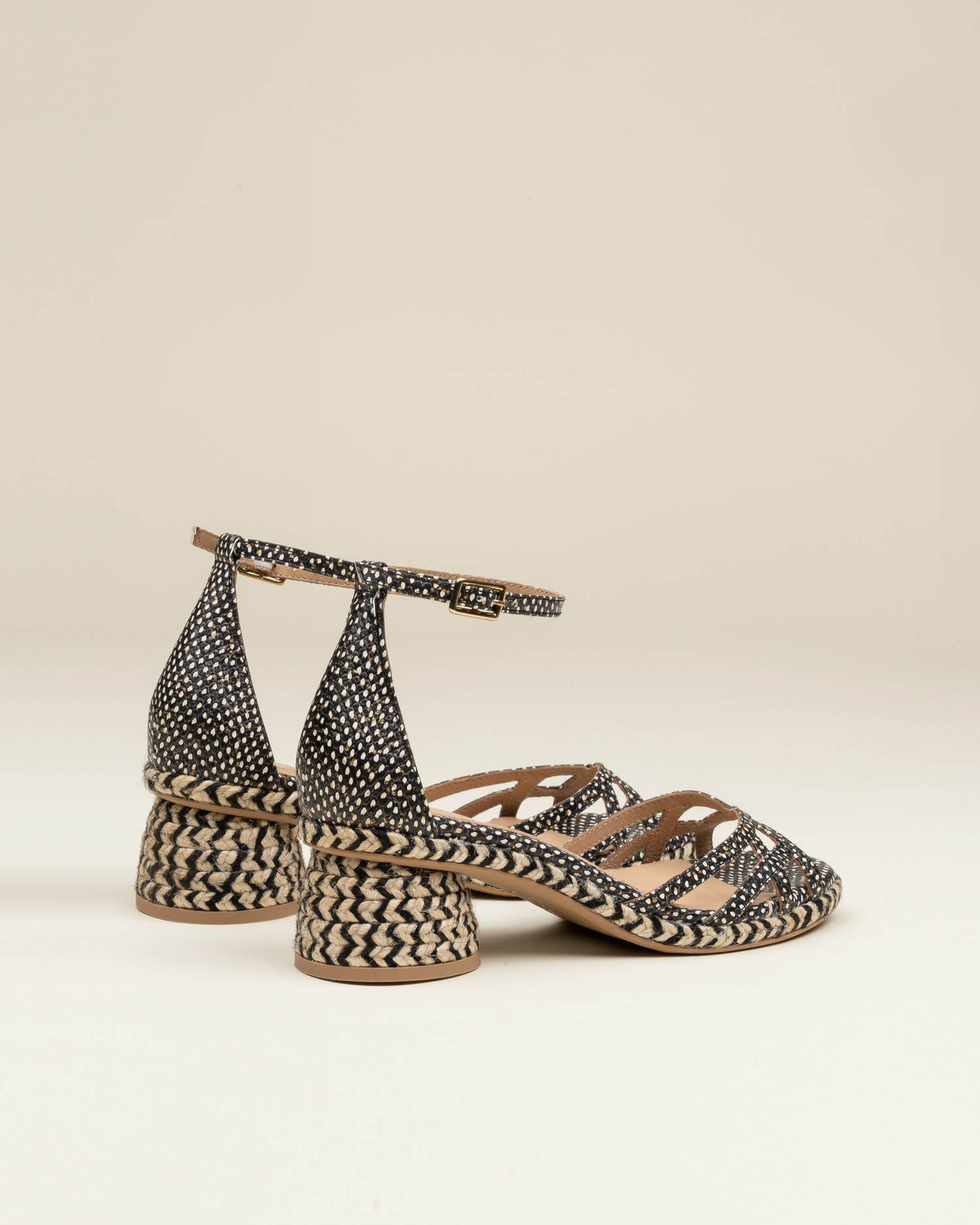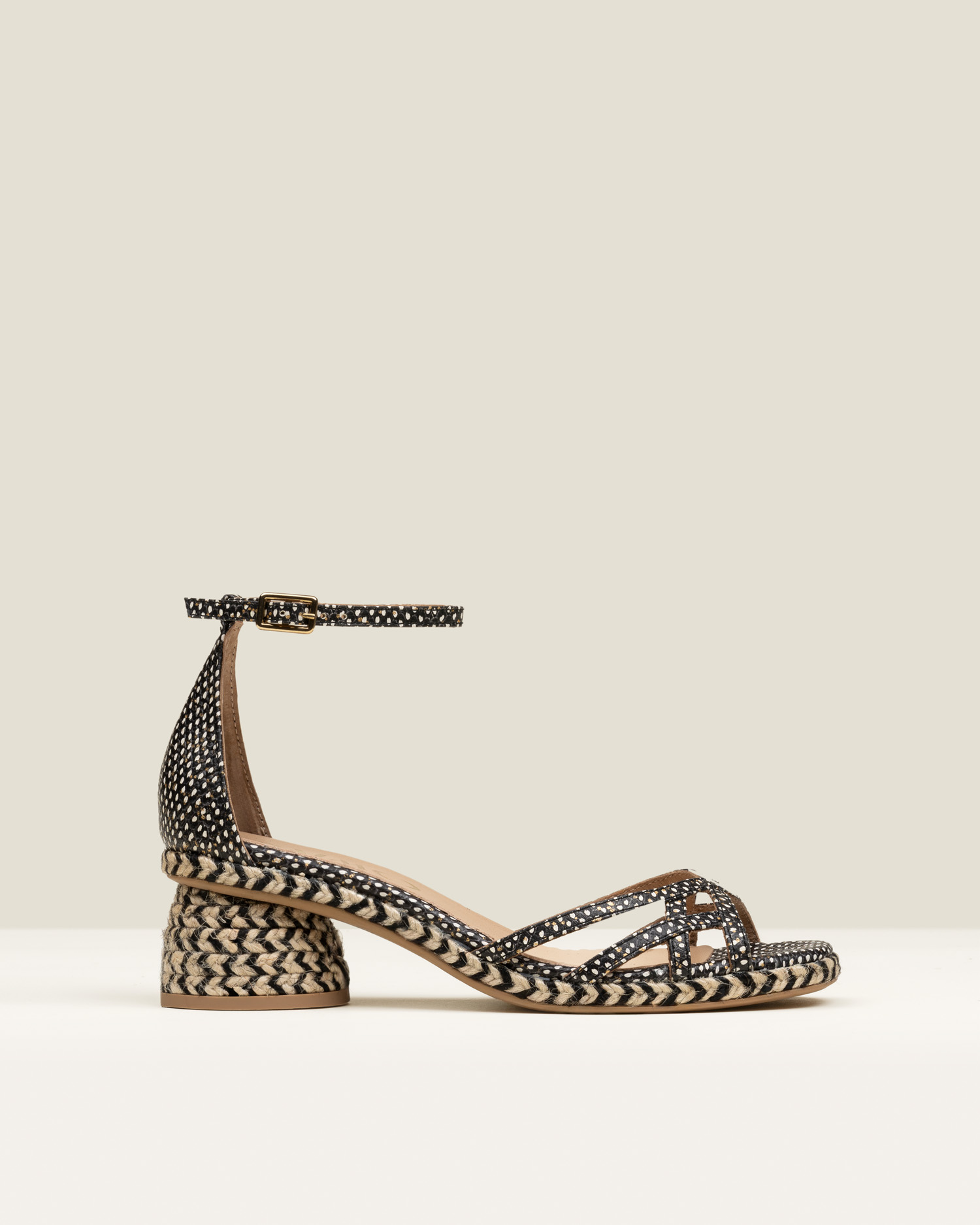 Celestia es una alpargata de tacón medio tipo sandalia, con cierre de hebilla y una silueta estilizada y femenina. Acabada en piel con pequeños puntitos delicados, aporta textura y un detalle sutil que enriquece el diseño con discreción.