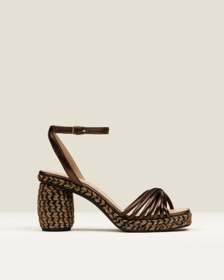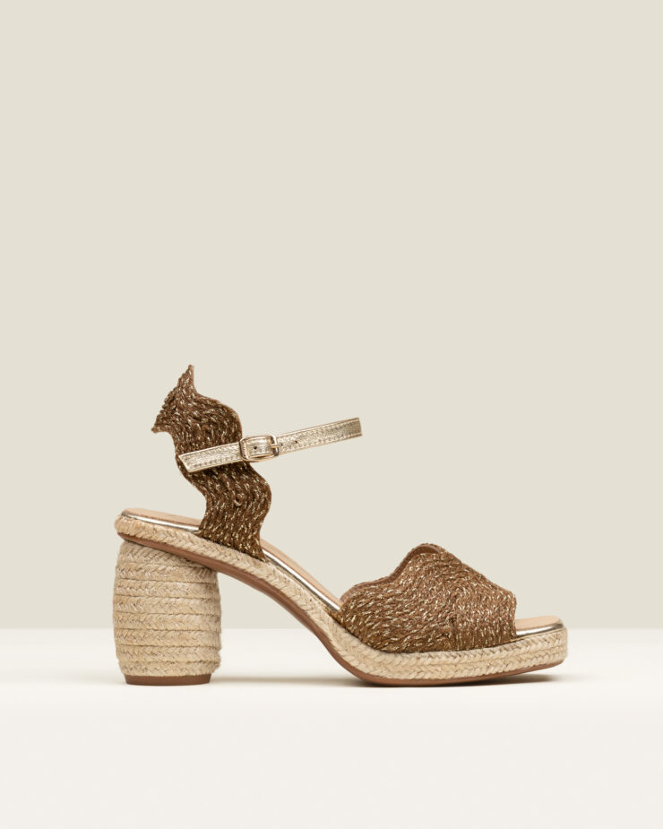 Fenda es una alpargata de tacón alto tipo sandalia, con cierre de hebilla y un lazo grande en ante que aporta un gesto femenino y marcado.