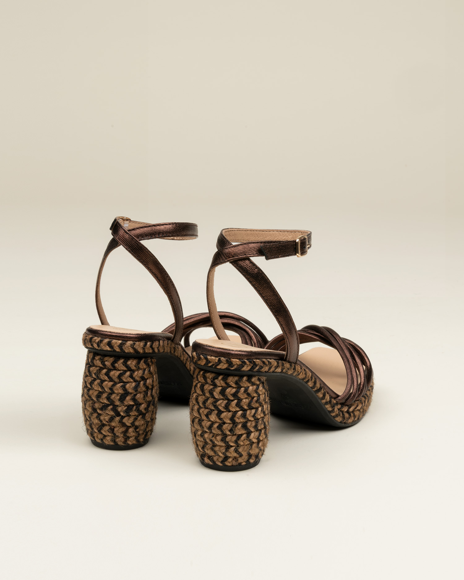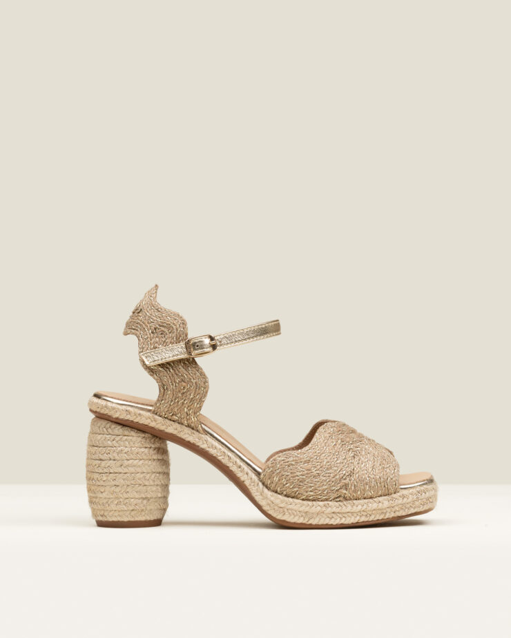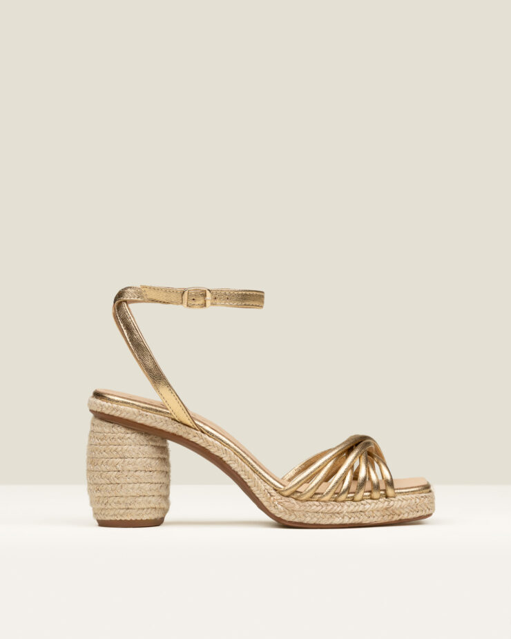Isolde es una alpargata de tacón alto tipo sandalia de diseño abierto, con tiras que dejan ver la piel y dibujan el pie con un gesto femenino y equilibrado.