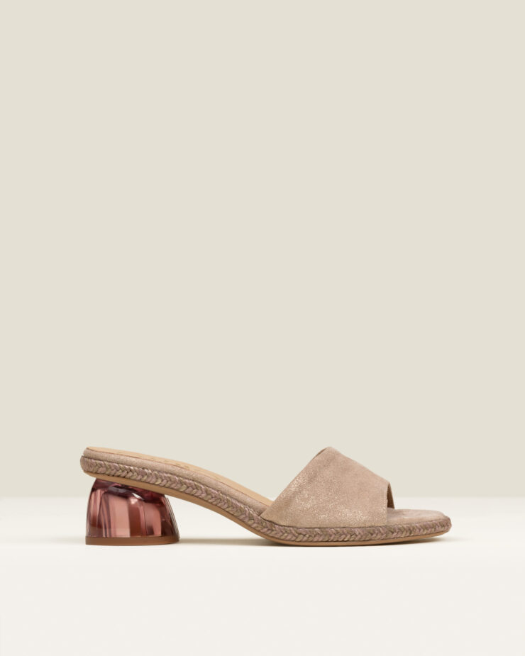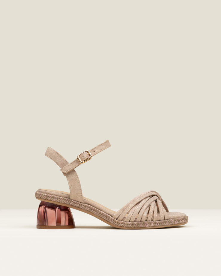 Kristen es una alpargata de tacón medio tipo sandalia de multi-tiras, con un diseño ligero que deja ver la piel y aporta un aire femenino y actual. Acabada en ante metalizado, incorpora un tacón de metacrilato transparente que aporta un gesto contemporáneo y distintivo.