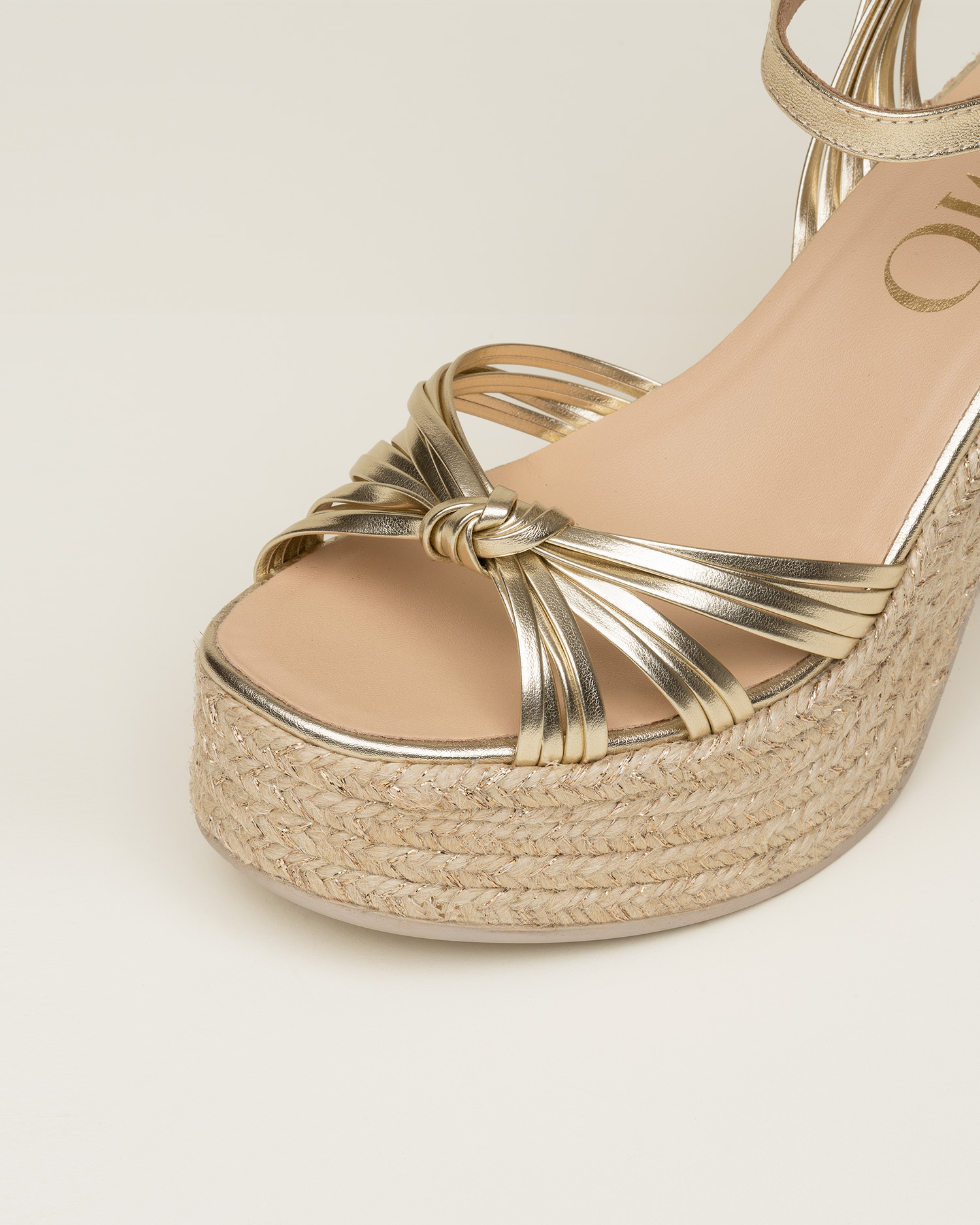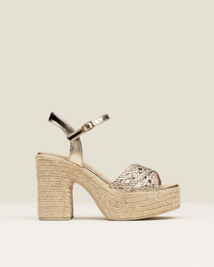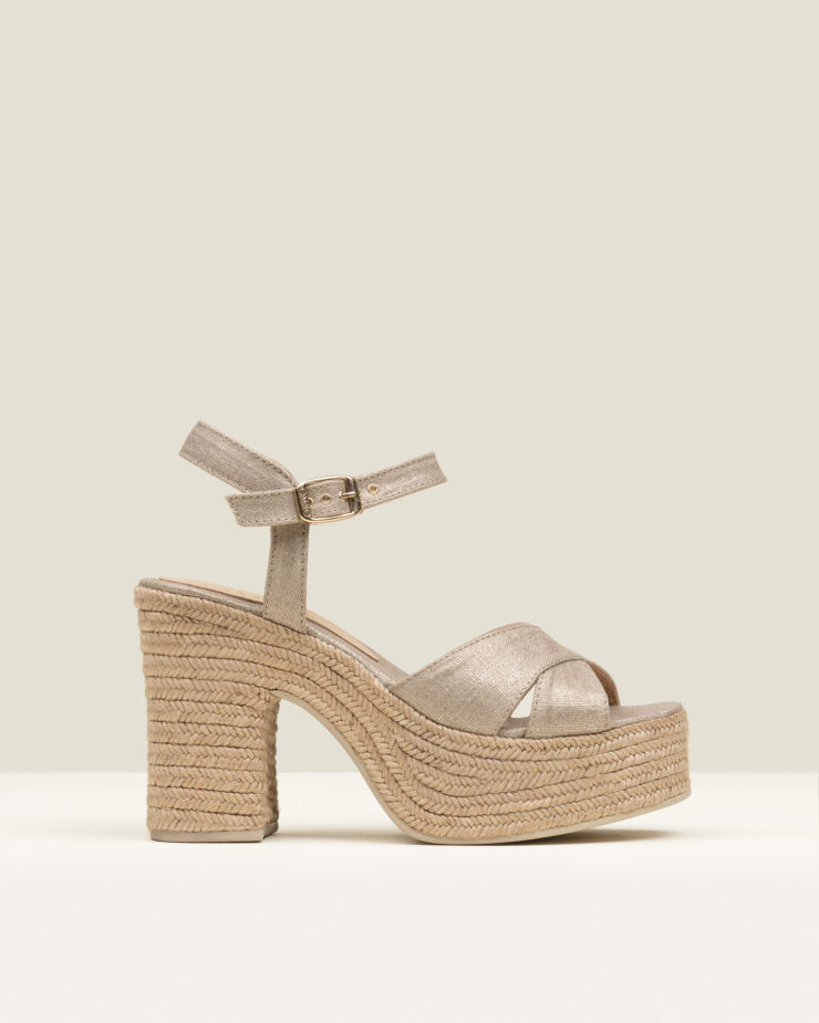 Lolita es una alpargata de tacón alto tipo sandalia de multi-tiras, con cierre de hebilla y acabada en piel napa metalizada que aporta un brillo luminoso y actual. El nudo metálico define el diseño con un gesto femenino y marcado.