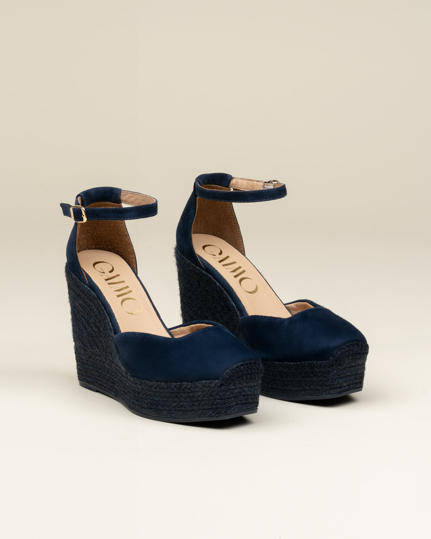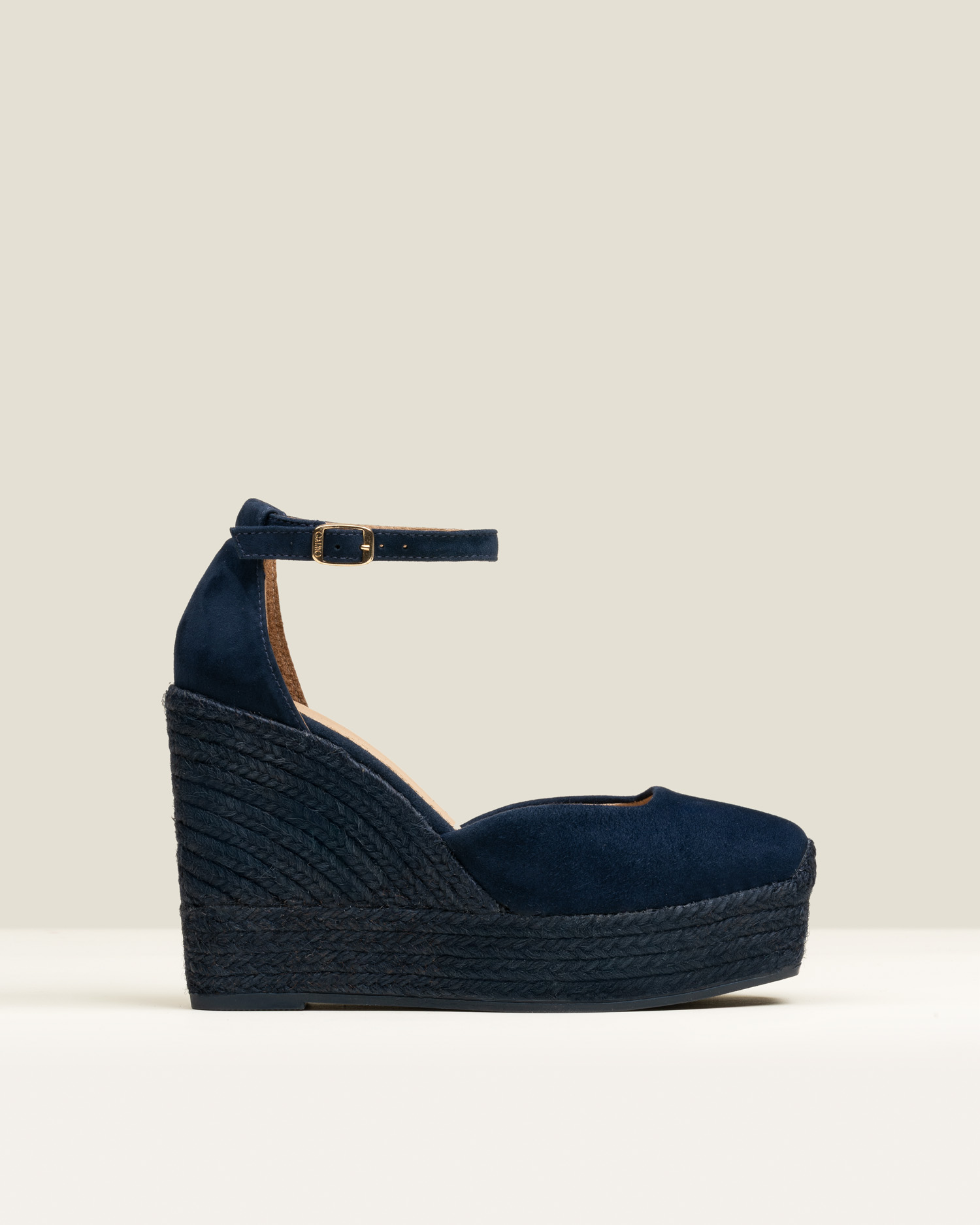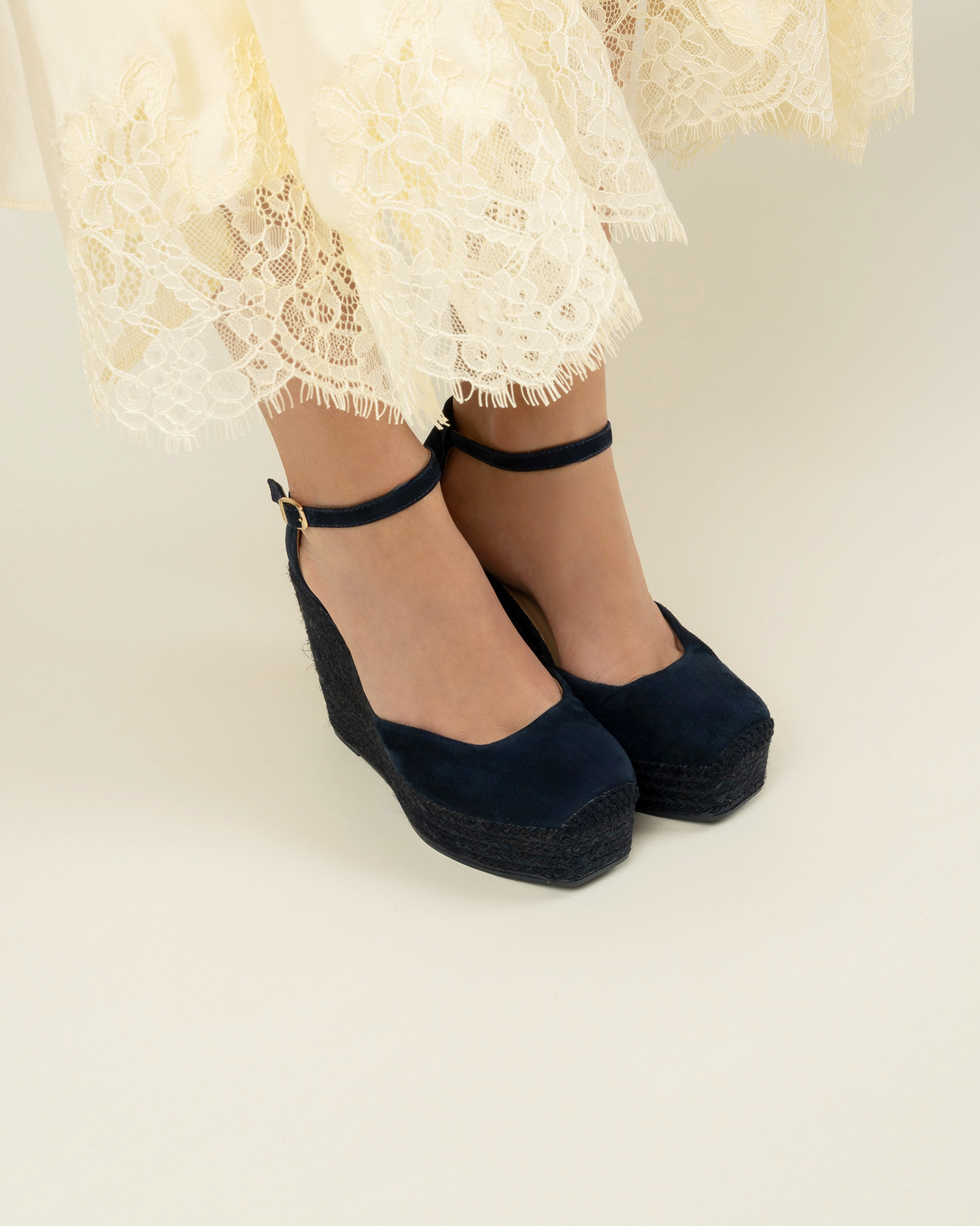 Sasia es una alpargata de cuña alta de diseño cerrado, con escote cuadrado y cierre de hebilla, que aporta una silueta definida y actual.