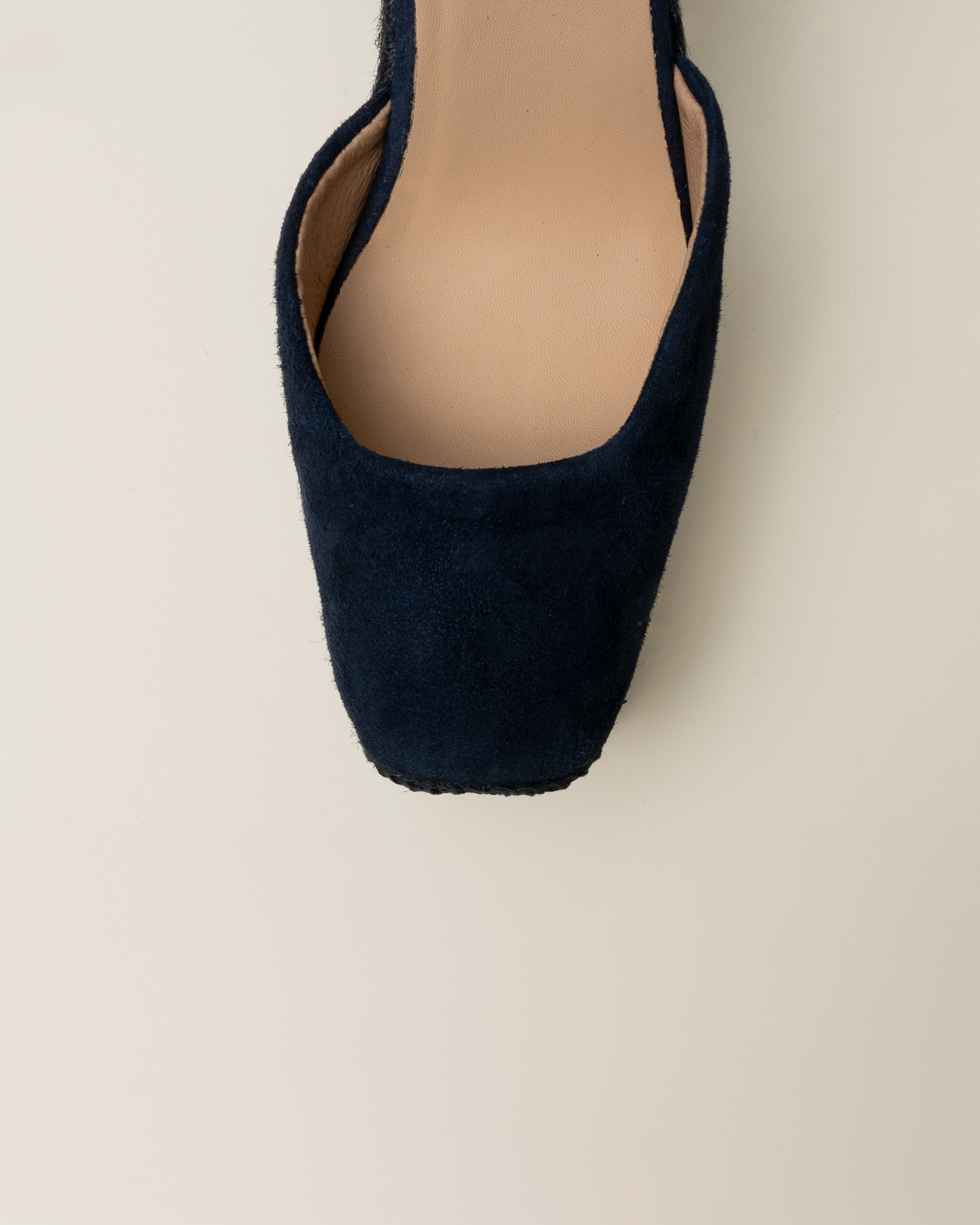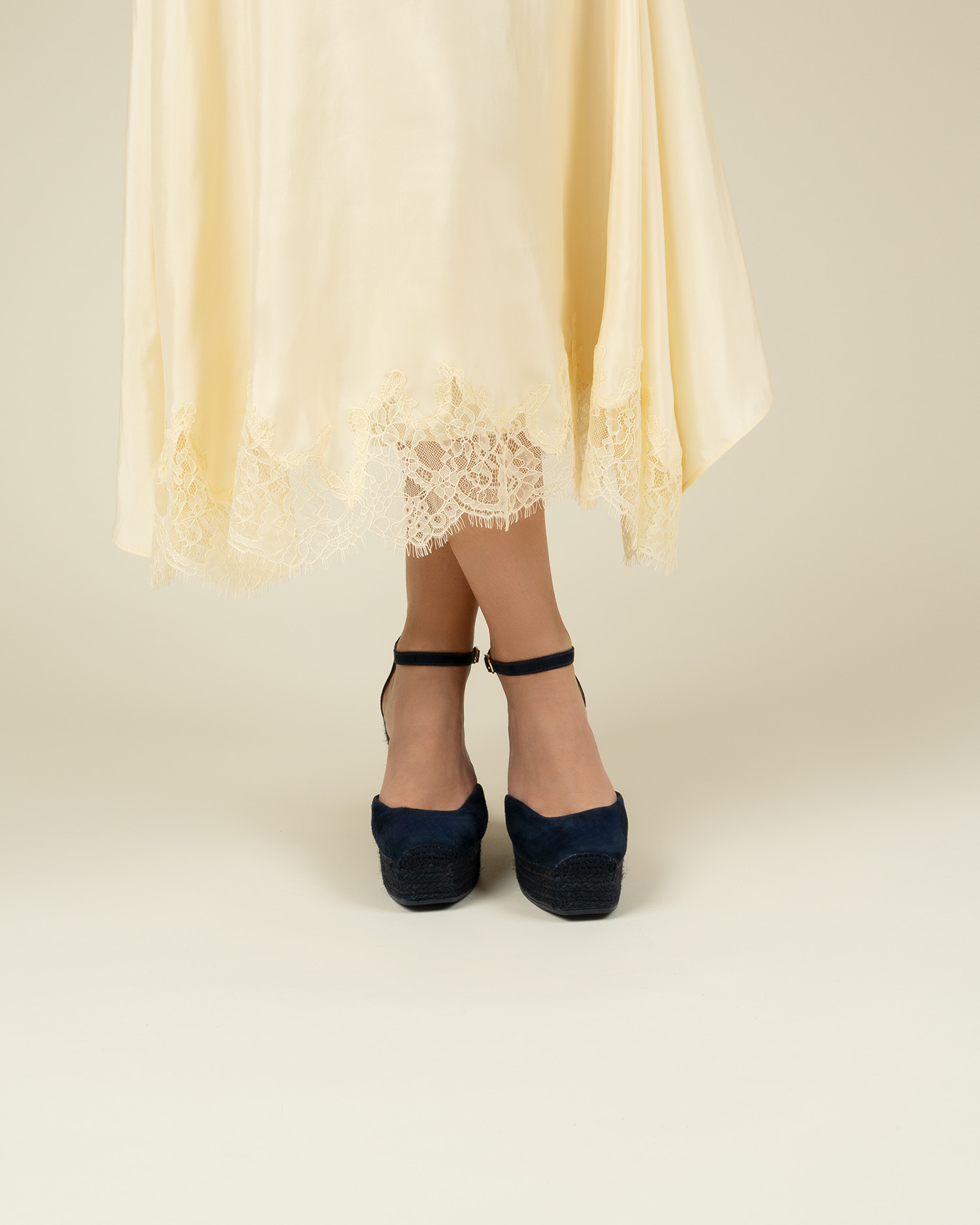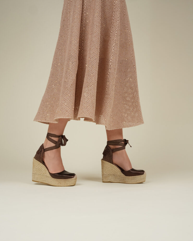 Sasia es una alpargata de cuña alta de diseño cerrado, con escote cuadrado y cierre de hebilla, que aporta una silueta definida y actual.